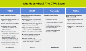 會計師考試過程是州會計委員會、美國註冊會計師協會、 美國國家會計委員會協會和 Prometric 之間的合作夥伴關係。請參閱此圖表以獲取更多詳細信息。